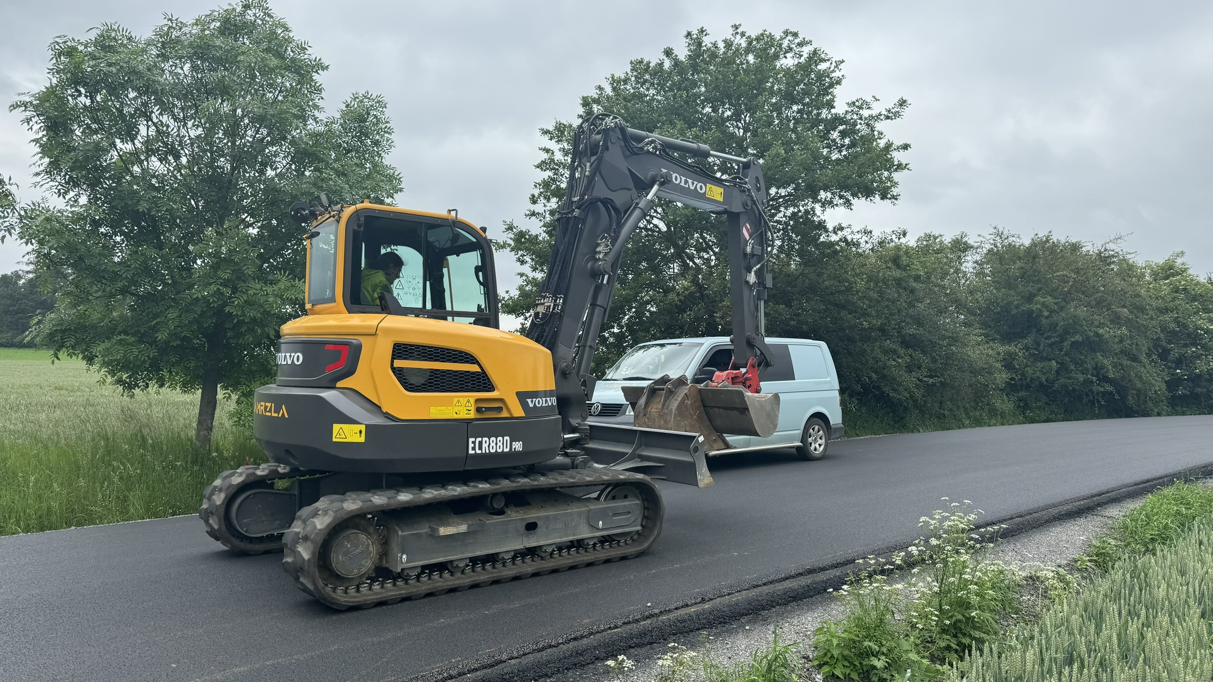 Patří do třídy midibagrů s lomeným výložníkem a tím zvyšuje efektivitu při provádění zemních prací. Je vybaven pryžovými pásy, které jsou šetrné k povrchům, jako jsou zámkové dlažby, zahrady atd. Stroj je vybaven hydraulickým rychloupínacím zařízením pro snadnou a rychlou výměnu lžic a příslušenství. Samozřejmostí je mimooosé kopání – tzv. KNICKMATIC, které stroji umožňuje kopání těsně podél zdí. Disponujeme kompletním vybavením ke stroji.